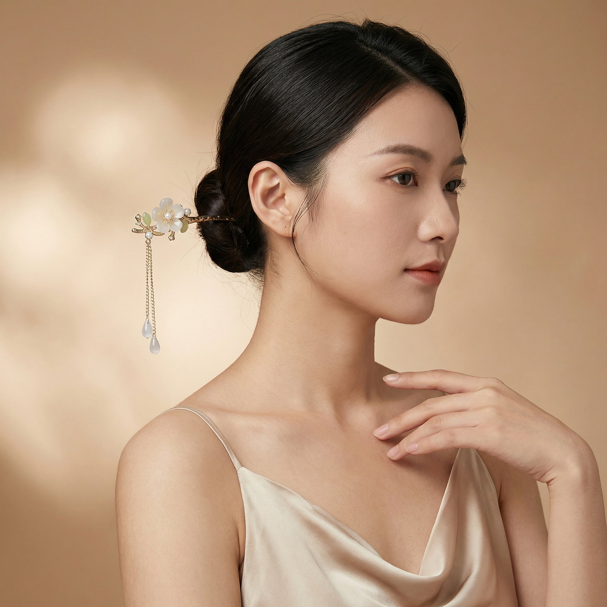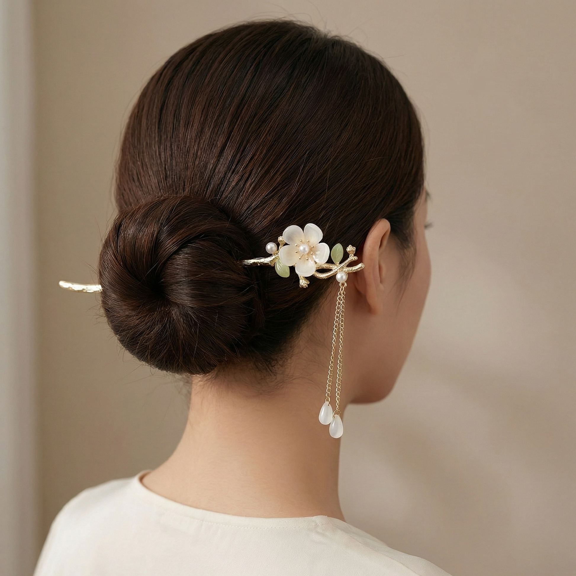 Slide through a bun or twisted updo — the flower sits above while the teardrop tassels frame the neck. Pairs beautifully with earth tones, whites, sage green, and soft pastels. Equally suited to quiet afternoons and special evenings. Works with medium to long hair.