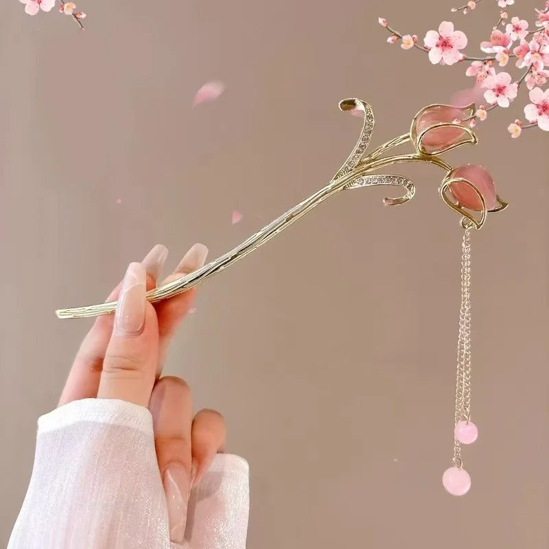 Quiet Bloom — Tender Bud is defined by quiet anticipation. Slender, curved stems extend gently forward, holding closed buds in soft blush tones—suggesting form, promise, and restraint rather than full display. A fine chain with subtle bead accents falls from the tip, adding movement that feels measured and unhurried.